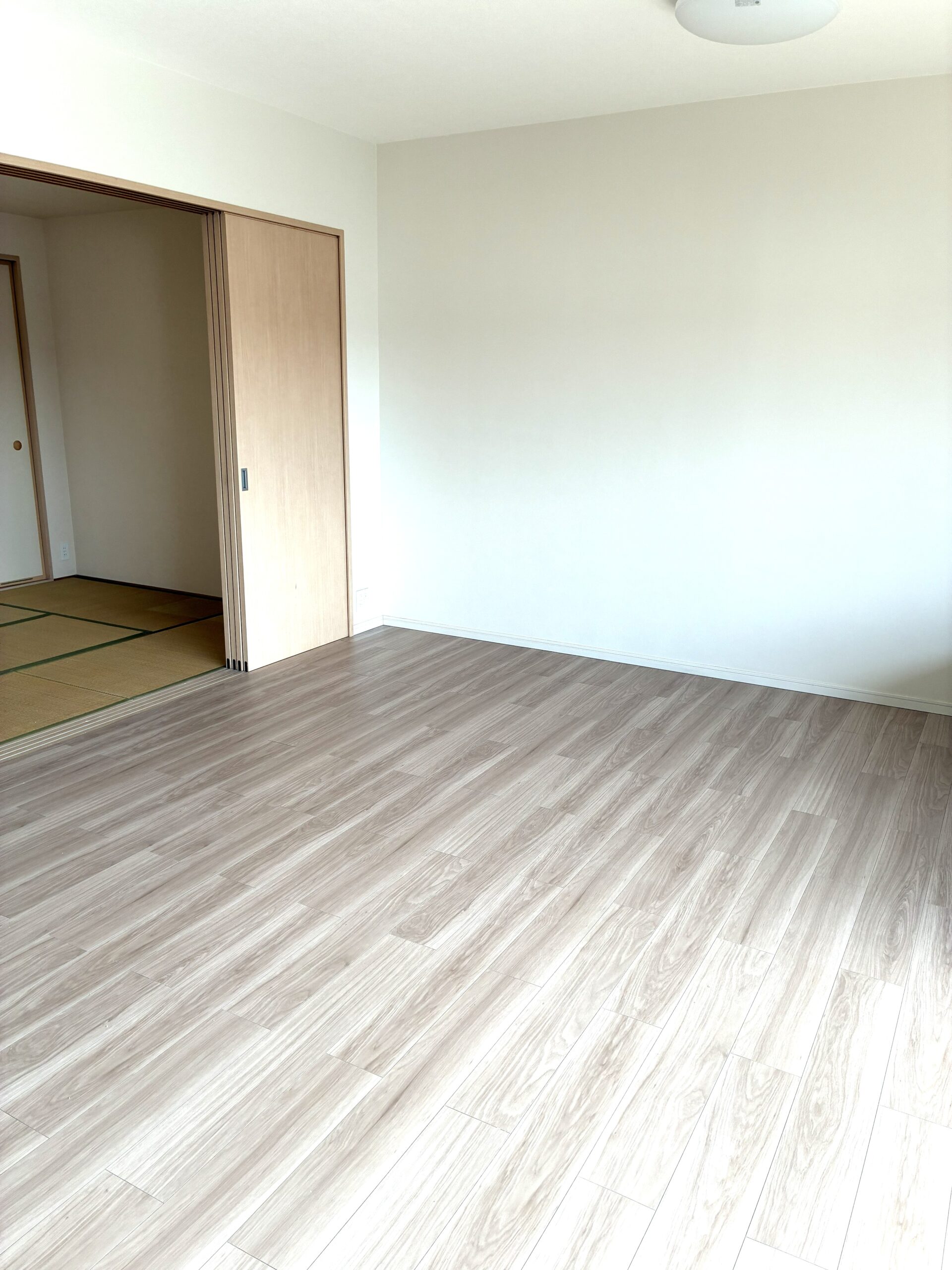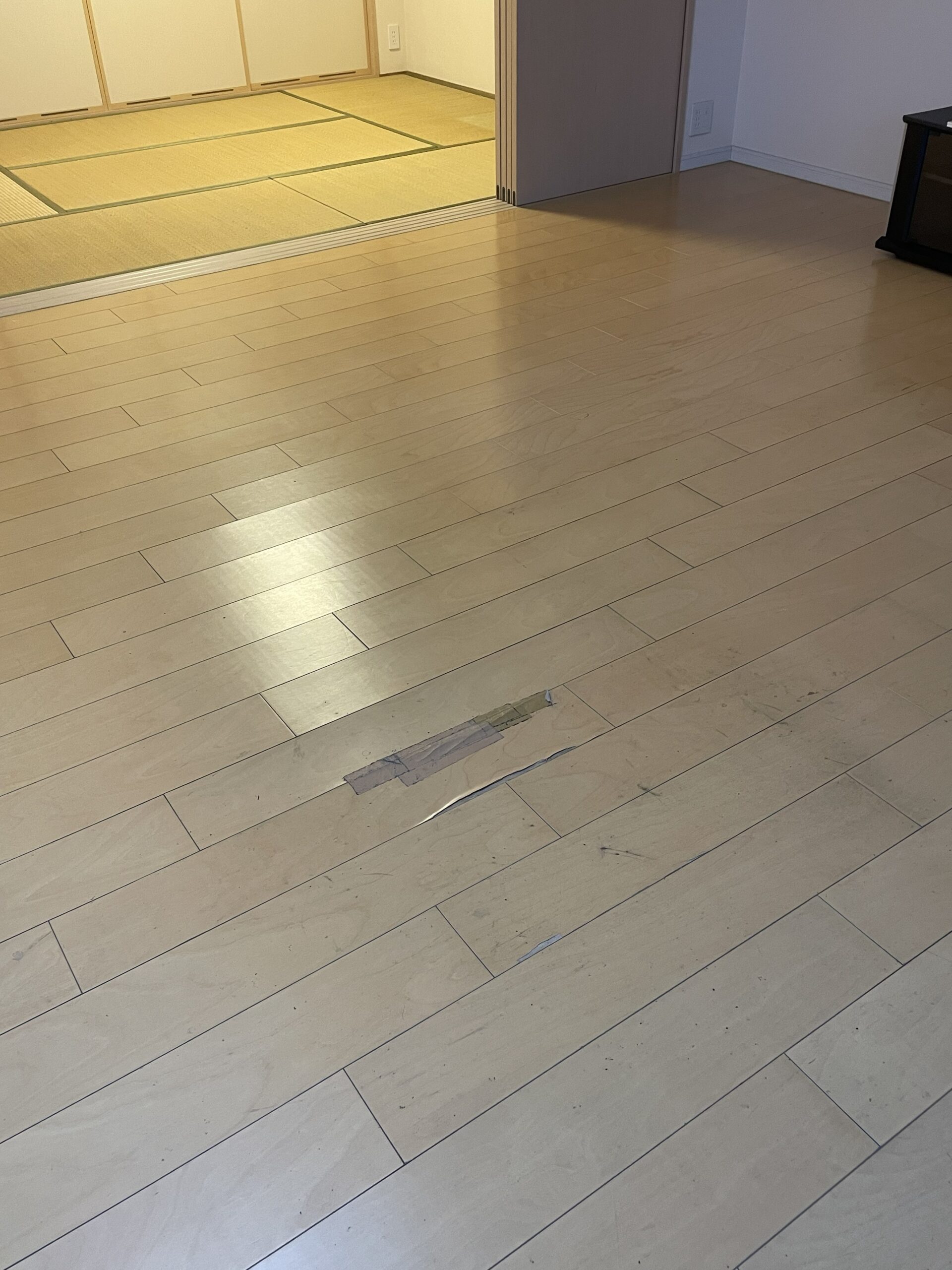 床暖房を備えたリビングのフローリングを、ウスイータで貼替えました。 既存の床暖房はそのまま活かし、上貼り工法で施工することで、解体を最小限に抑えています。 床暖房対応のウスイータを採用したことで、熱効率を損なうことなく、見た目も美しく一新されたリビング空間に。 工期が短い点もメリットです。あわせて、壁と天井のクロスも貼替えを行い、明るいリビングに。 キズが気になっていた床が、快適で明るい印象のリビングへと生まれ変わりました。
