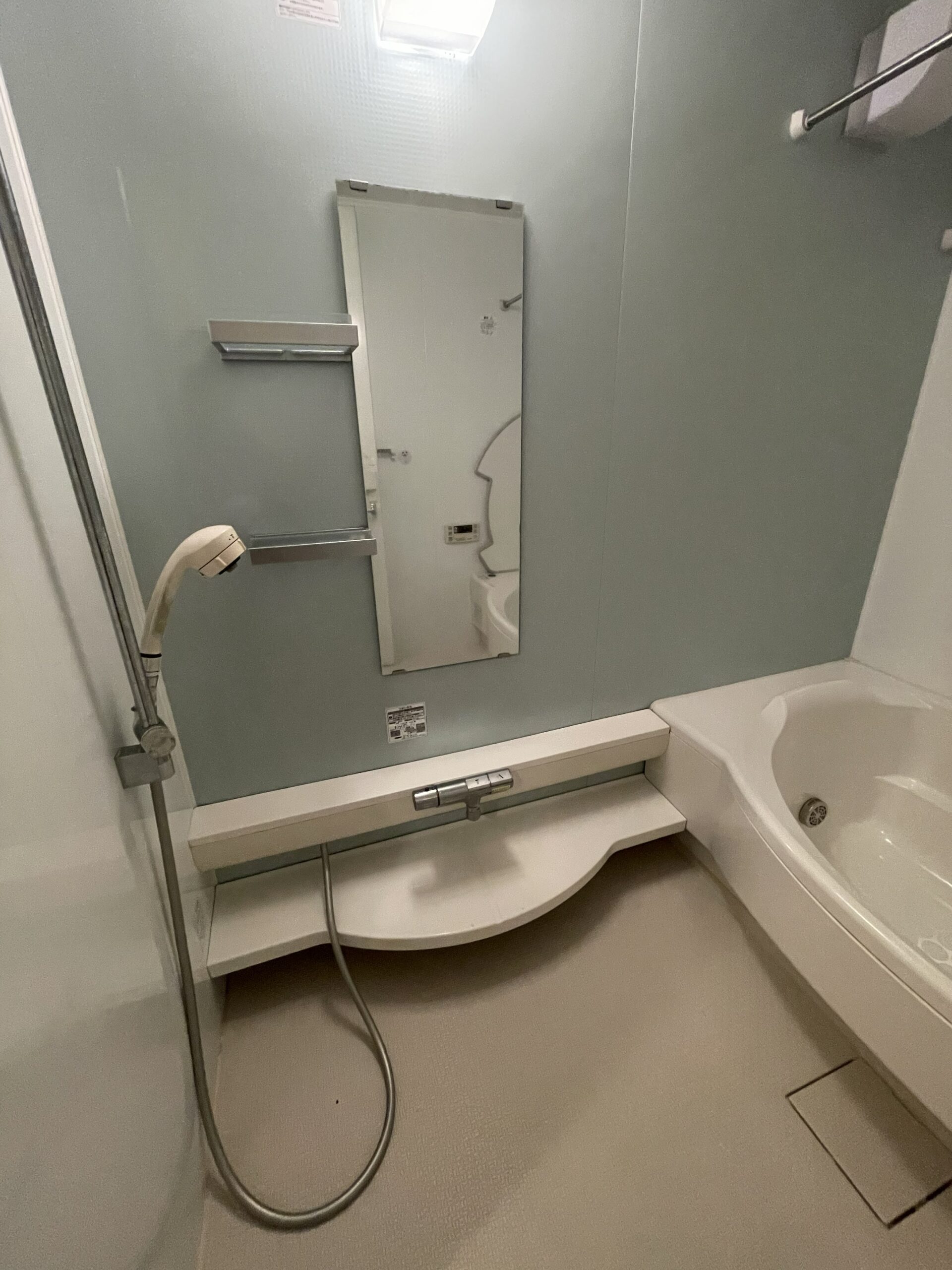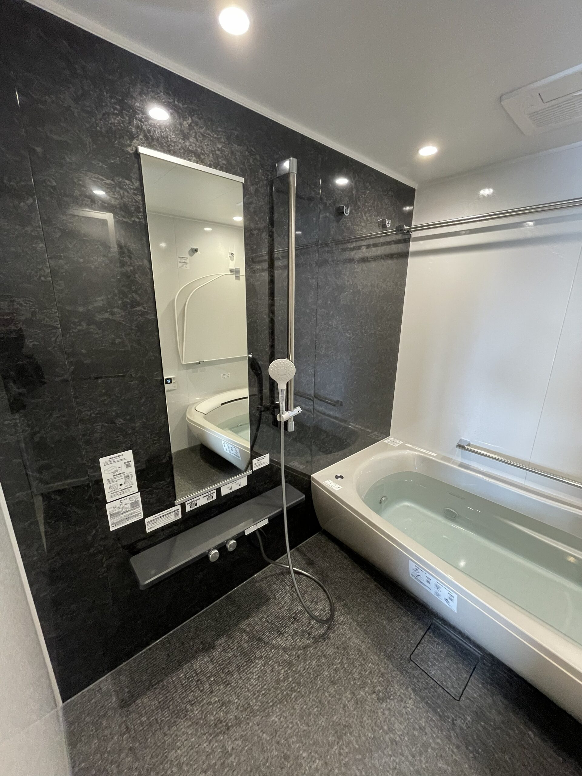 旦那様がこだわった浴室は、黒をアクセントにしたシックで落ち着きのある空間に。 肩湯を取り入れ、一日の疲れをゆったりと癒せるバスルームに仕上げました。 また、同居されているお母さまのことを考え、バリアフリー設計とし、安心して使える浴室となっています。 デザイン性と使いやすさを両立した、家族みんなにやさしい空間です。