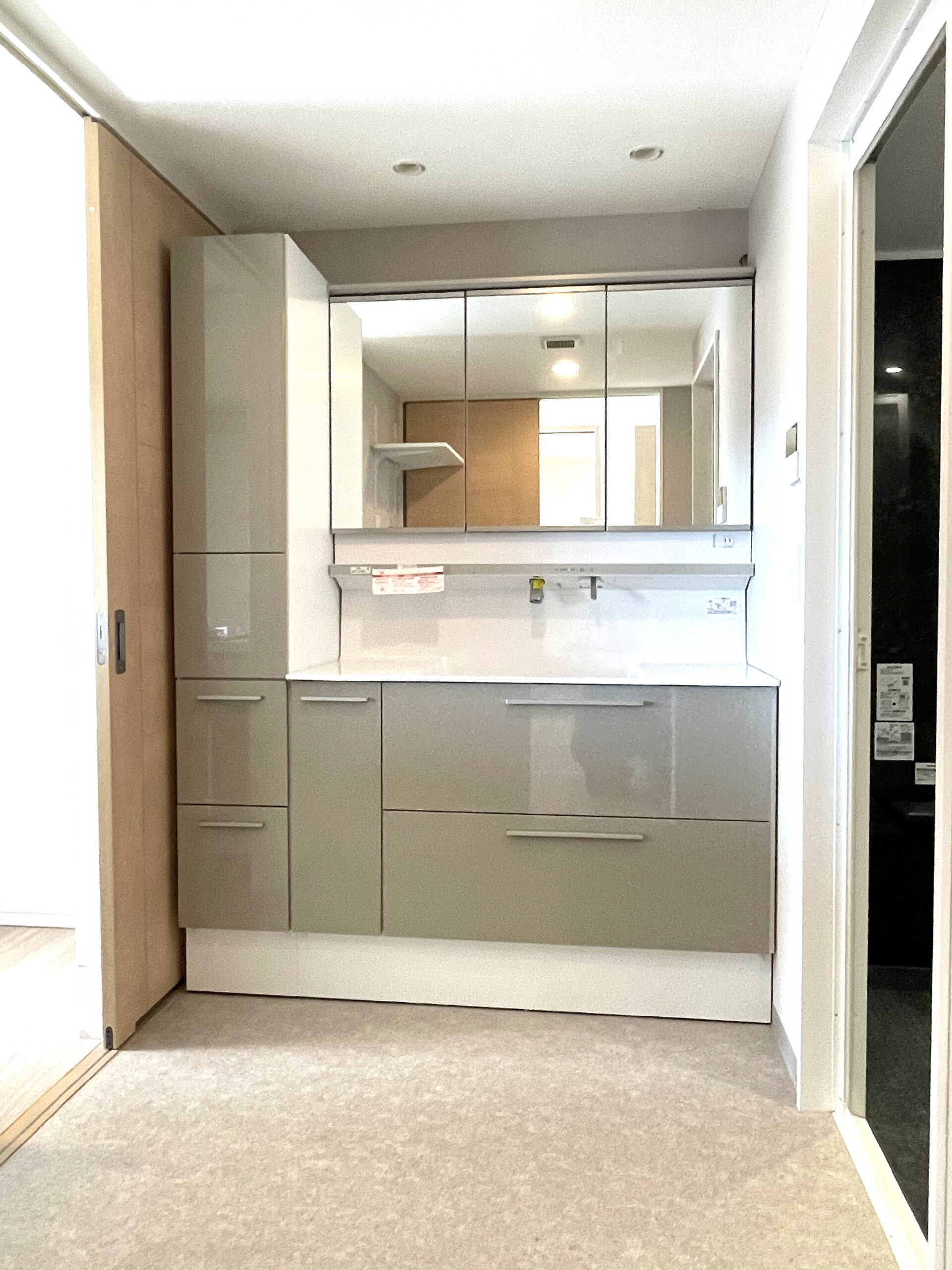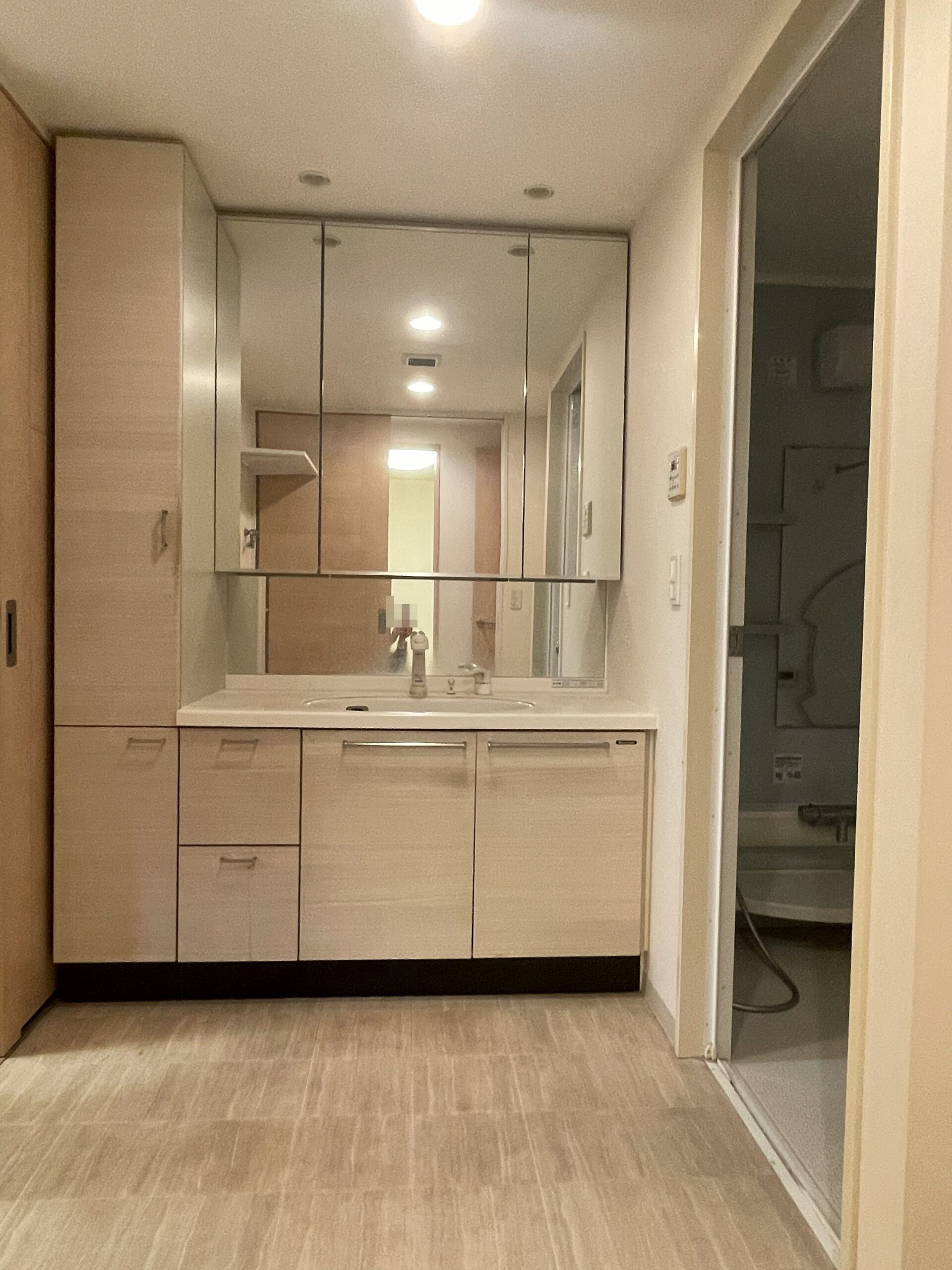 水栓はカウンター上部に設置し、水栓まわりに水が溜まりにくく、日々のお手入れがしやすい仕様としました。 また、除菌水を取り入れることで、洗面まわりを清潔に保てるように。 間口はW1500とし、収納量もたっぷり確保。 クロスとクッションフロアはベージュ系でまとめ、明るさと上品さを兼ね備えた、落ち着きのある洗面空間に。