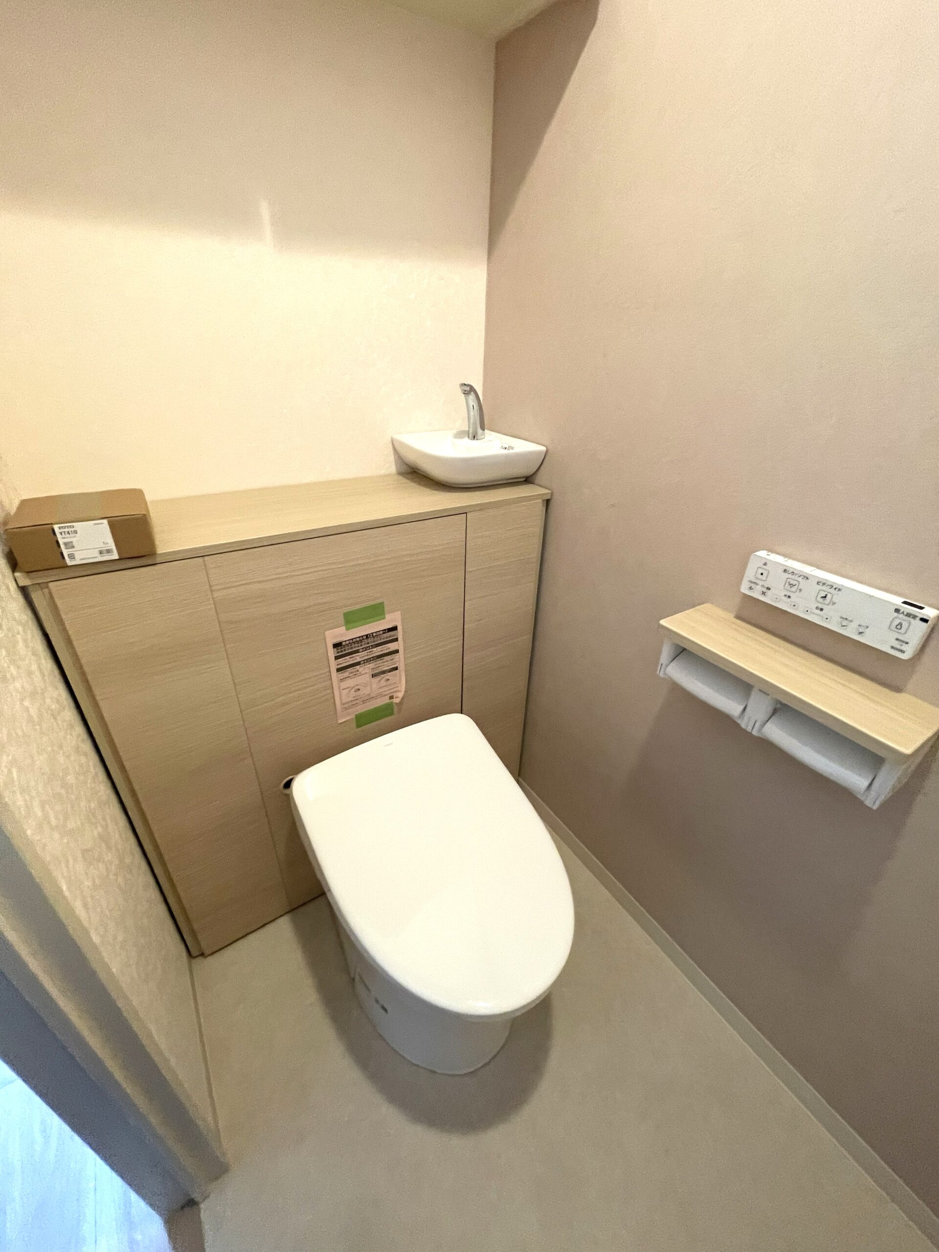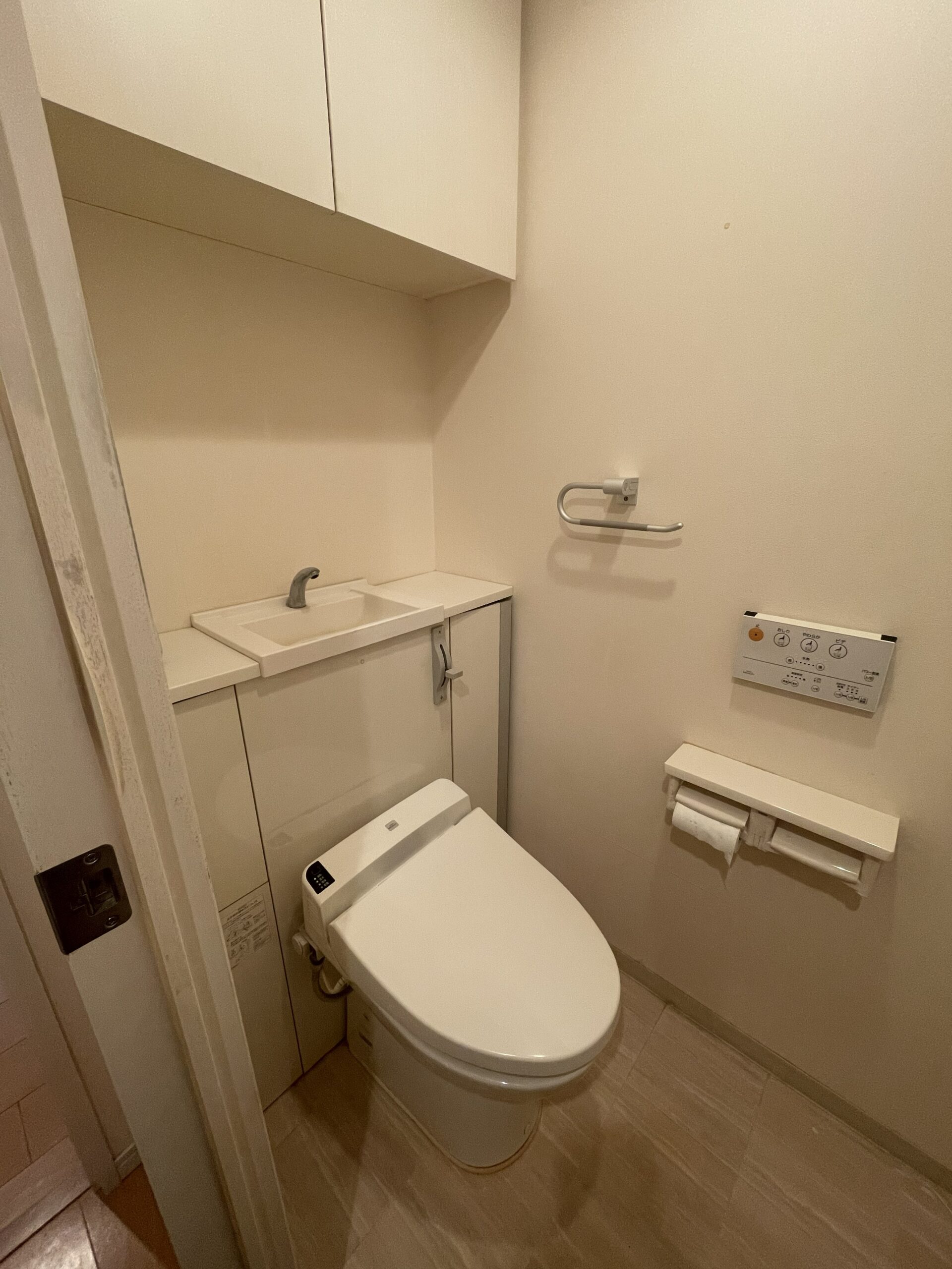 リフォーム前も収納付きの同形状トイレをお使いでしたが、経年によりリフォームを行いました。トイレットペーパーや清掃道具などが収納できてスッキリ空間に。床に物を置かないのでお掃除もしやすくなっています。 壁の一部にはアクセントクロスを採用。シンプルな中にも程よいアクセントが加わり、落ち着きと上質感のあるトイレ空間になりました。
